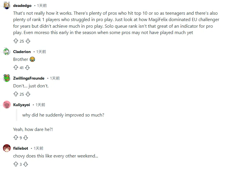 看看MagiFelix,在欧服王者局统治了多少年,结果打职业也没出啥成绩。Rank分对职业比赛真没多大参考价值。尤其是现在赛季刚开始,好多职业哥可能都没怎么打呢。